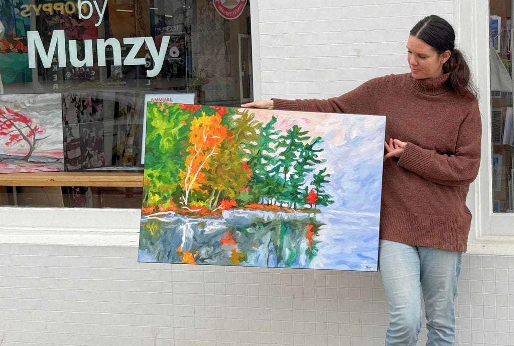 Live with the beauty of Muskoka’s autumn year-round through Munzy’s one-of-a-kind impressionist piece, capturing the serene shoreline of Riverdale Island on the Joseph River in fall.